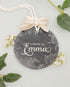Cette étiquette en ardoise s’inspire des gravures botaniques et associe une écriture aux belles ligatures à une illustration de feuillages tout en finesse.